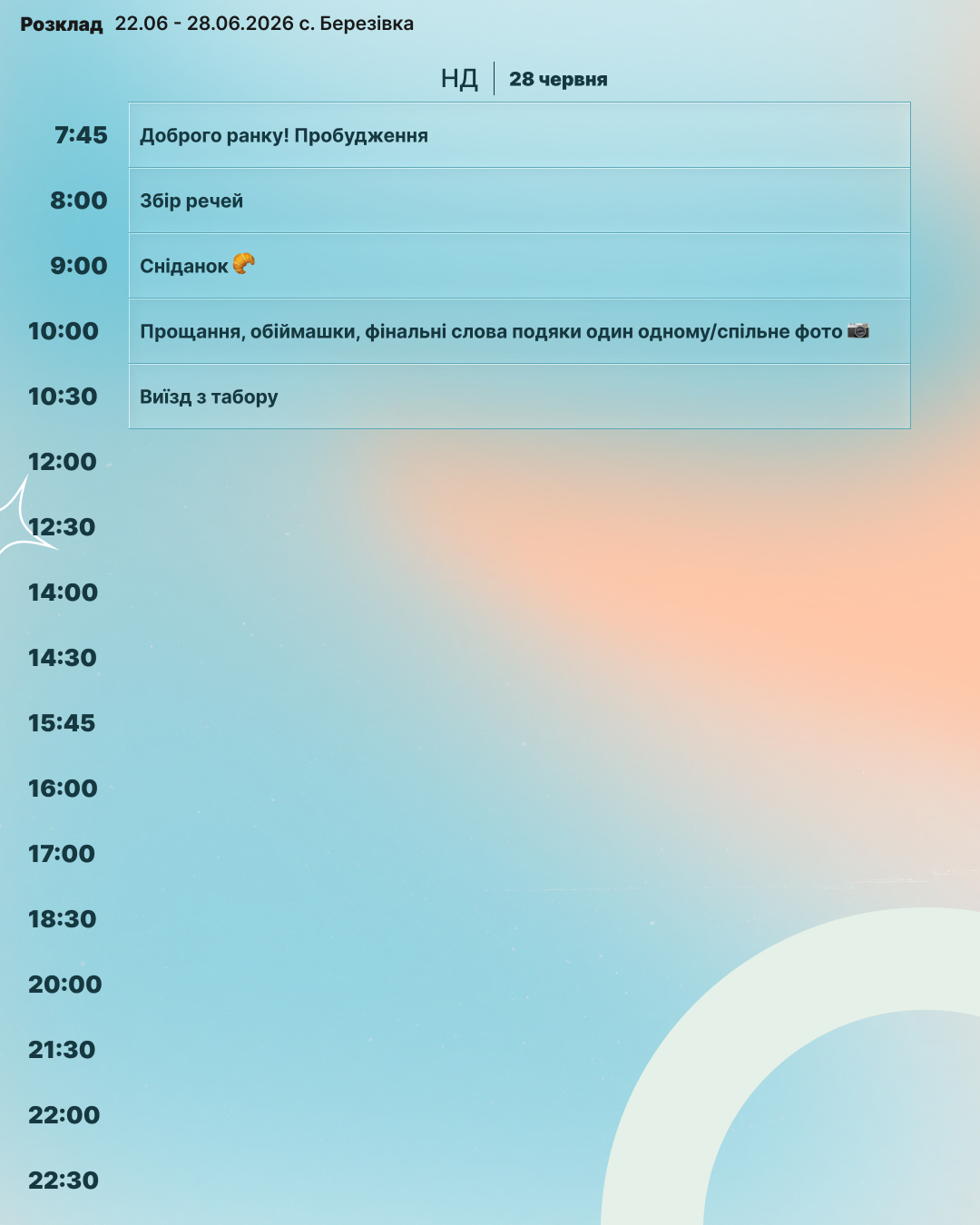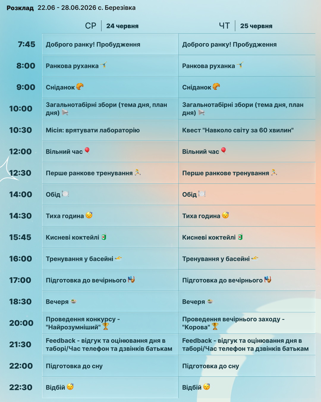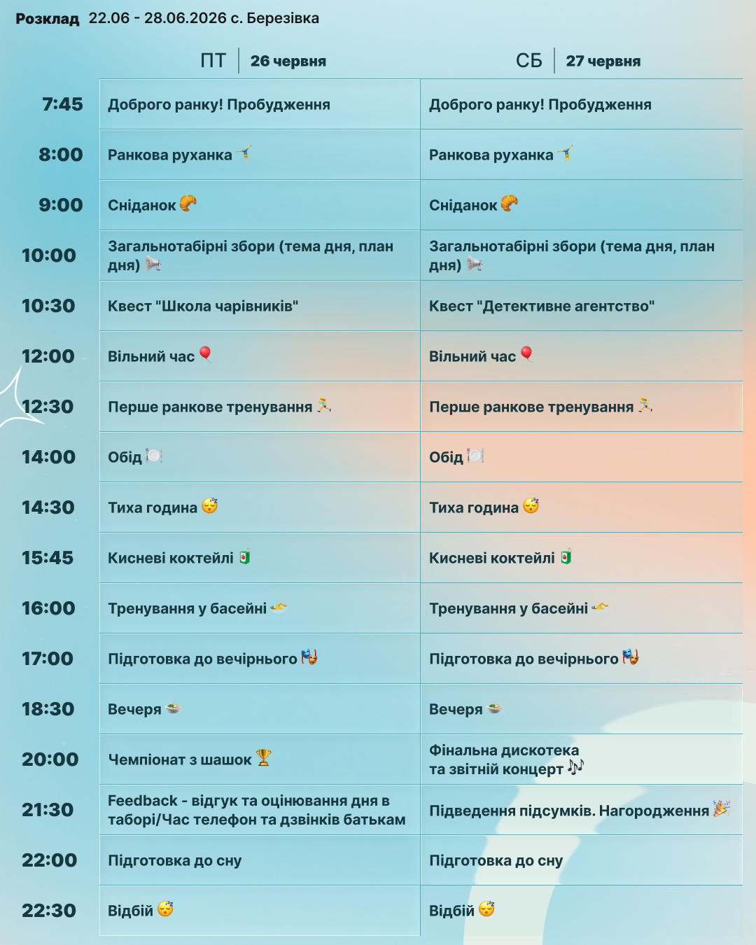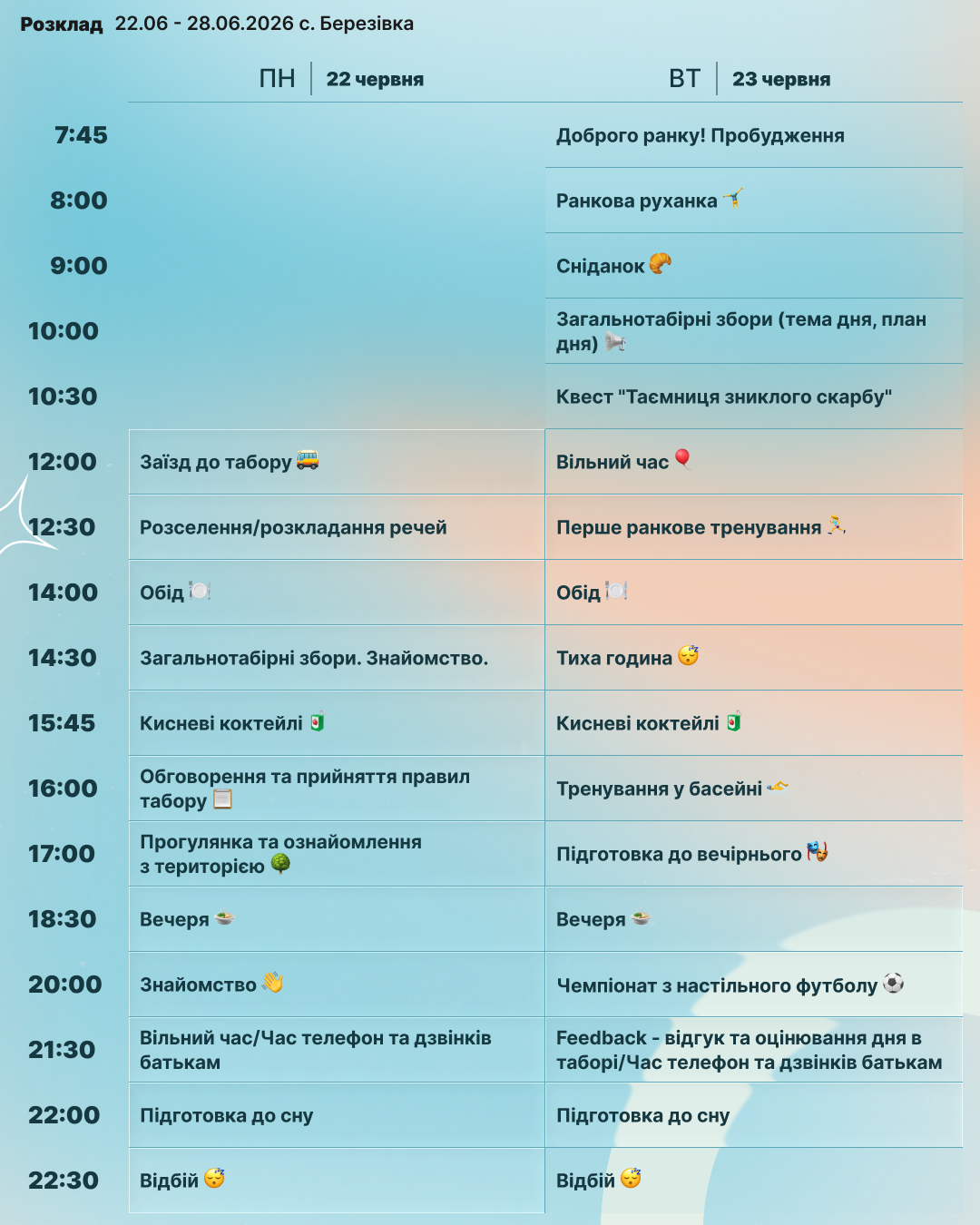 Цього літа відбудуться дві зміни — у червні та серпні. Це унікальна можливість для харків’ян відправити дитину на якісний та безпечний відпочинок поруч із домом. На учасників табору чекає насичена спортивна програма, цікаві розважальні активності, збалансоване та корисне харчування, басейн, а також проживання у двомісних номерах із усіма зручностями. З дітьми працюватимуть досвідчені кемп-лідери, які створять дружню атмосферу, підтримку та незабутні враження для кожного учасника. Pushcamp — це більше, ніж табір. Це місце розвитку, нових знайомств і яскравих емоцій. Реєструйтеся вже зараз та подаруйте дитині незабутнє літо!